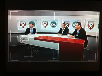 | Im Teleclubstudio in Volketswil. Im Bild die beiden Moderatoren der Französischen Schweiz und der Fussballspieler Alain Gaspoz. Das Bild ist durch den Studiosucher der Kamera gemacht. |