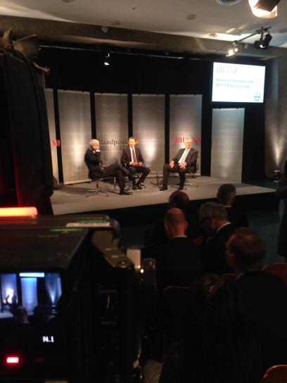 Für die Sendung "BILANZ Standpunkte. Im Bild Jörg Reinhardt, VR Novartis, Dirk Schütz, Moderator und Christoph Franz, VR Roche
